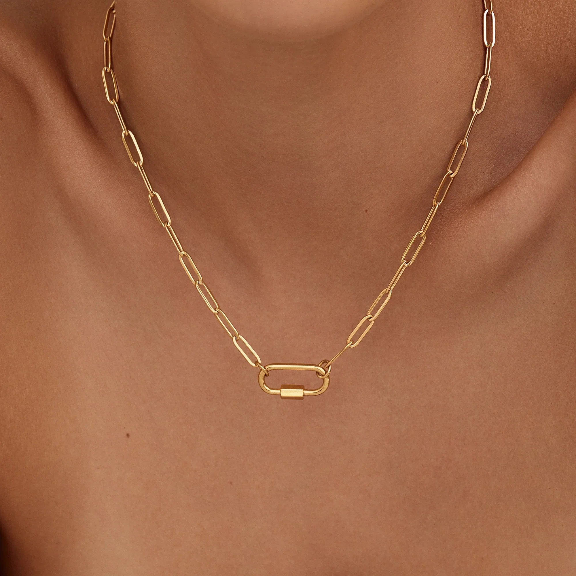 Ihre Geschichte, auf Ihre Weise. Diese moderne Paperclip-Kette verfügt über einen eleganten Karabiner-Charm-Lock, der dafür gemacht ist, Ihre Lieblingsanhänger, Erinnerungen oder die Initialen eines geliebten Menschen zu tragen. Sie ist eine Leinwand für persönlichen Ausdruck – ob minimal getragen oder mit Bedeutung gefüllt. Tragen Sie sie auf Ihre Weise und lassen Sie sie sich mit Ihnen weiterentwickeln.