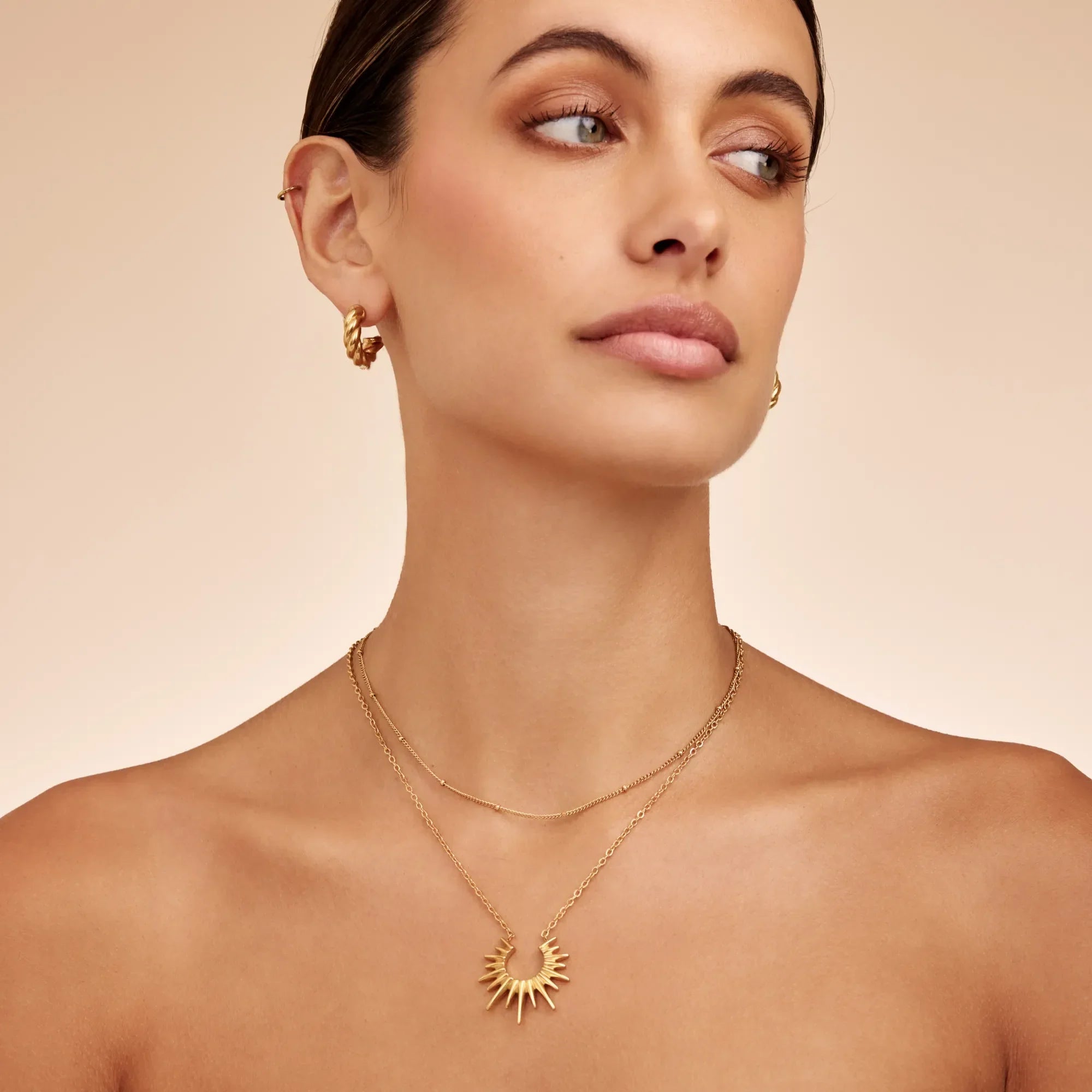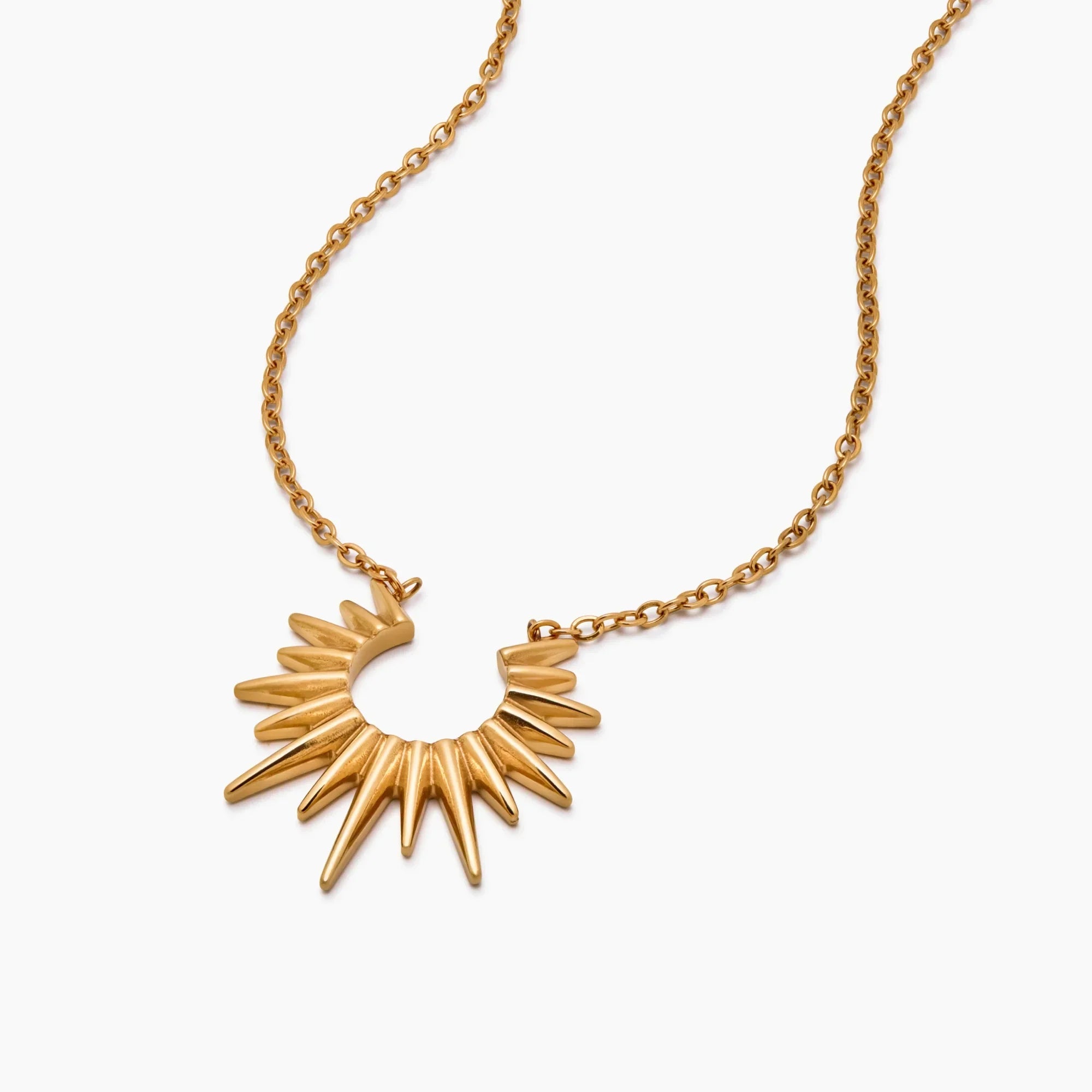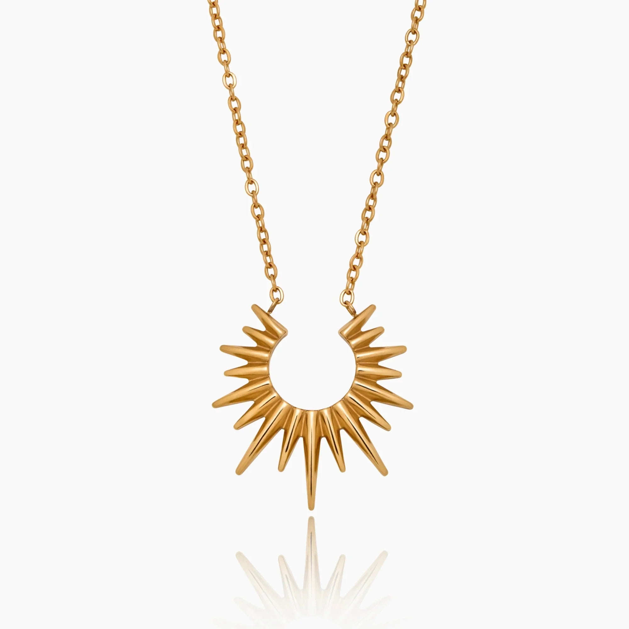 Die Helia Sunburst Halskette besticht durch ein eindrucksvolles Design aus goldenen Strahlen, die von einem zentralen Kreis ausgehen, gefertigt aus hochwertigem, 18K vergoldetem Edelstahl an einer feinen Kette. Dieses wasserfeste und anlaufbeständige Schmuckstück setzt ein markantes und zugleich elegantes Statement und bewahrt seinen luxuriösen Glanz im Alltag. Inspiriert von himmlischen Sonnenstrahlen entsteht ein besonderer Blickfang, der das Licht wunderschön einfängt. Tragen Sie diesen ausdrucksstarken Anhänger zu schlichten Ausschnitten, damit sein architektonisches Design im Mittelpunkt steht und Ihr Gesicht in goldenes Licht rahmt.